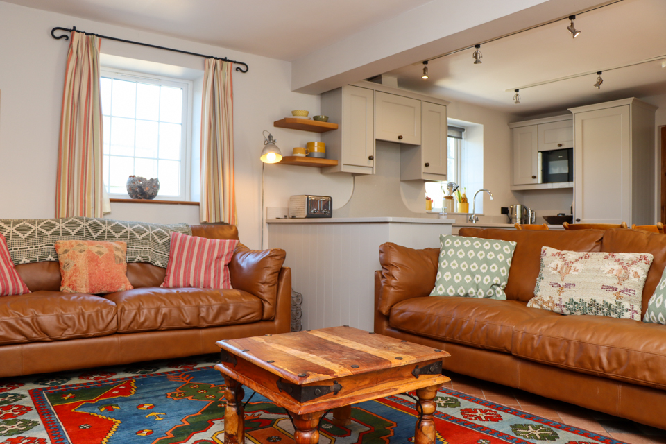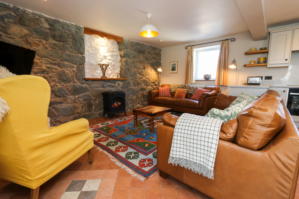 Mae gan Ysgubor gyfoeth o drawstiau a waliau cerrig agored ac mae wedi ei addurno yn chwaethus. Mae'r sofas lledr yn gyfforddus a deniadol. A'r gadair freichiau felen yr un modd.