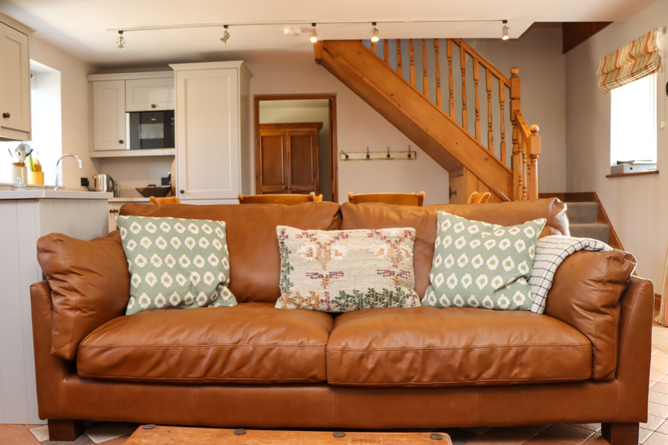 - soffa lledr i dri person gyda cegin a grisiau tu nol