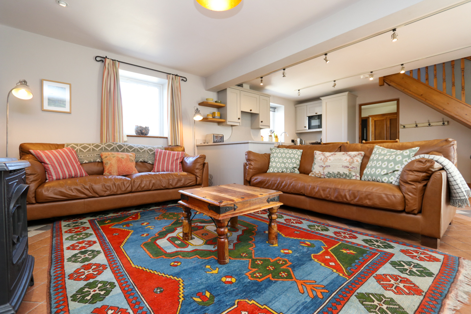 - ystafell fyw gyda carped lliwgar a chegin tu nol