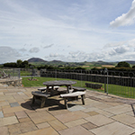 - gardd fawr gyda gol pel droed a trampoline i blant